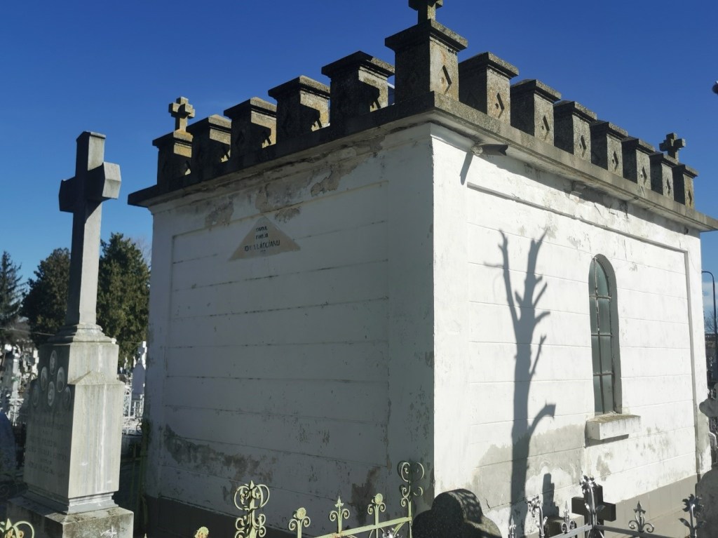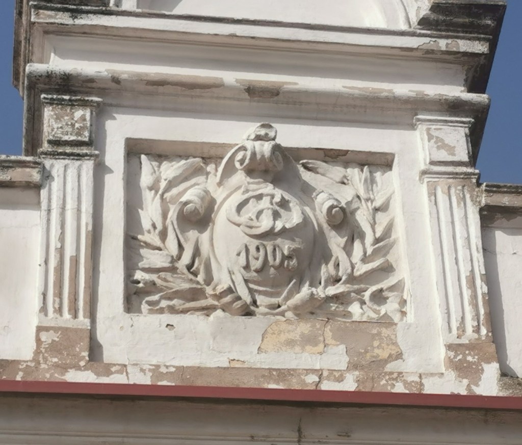 Monograma lui Ilie Câsâru și anul construcției inscripționate pe frontonul clădirii