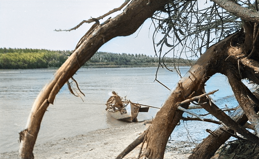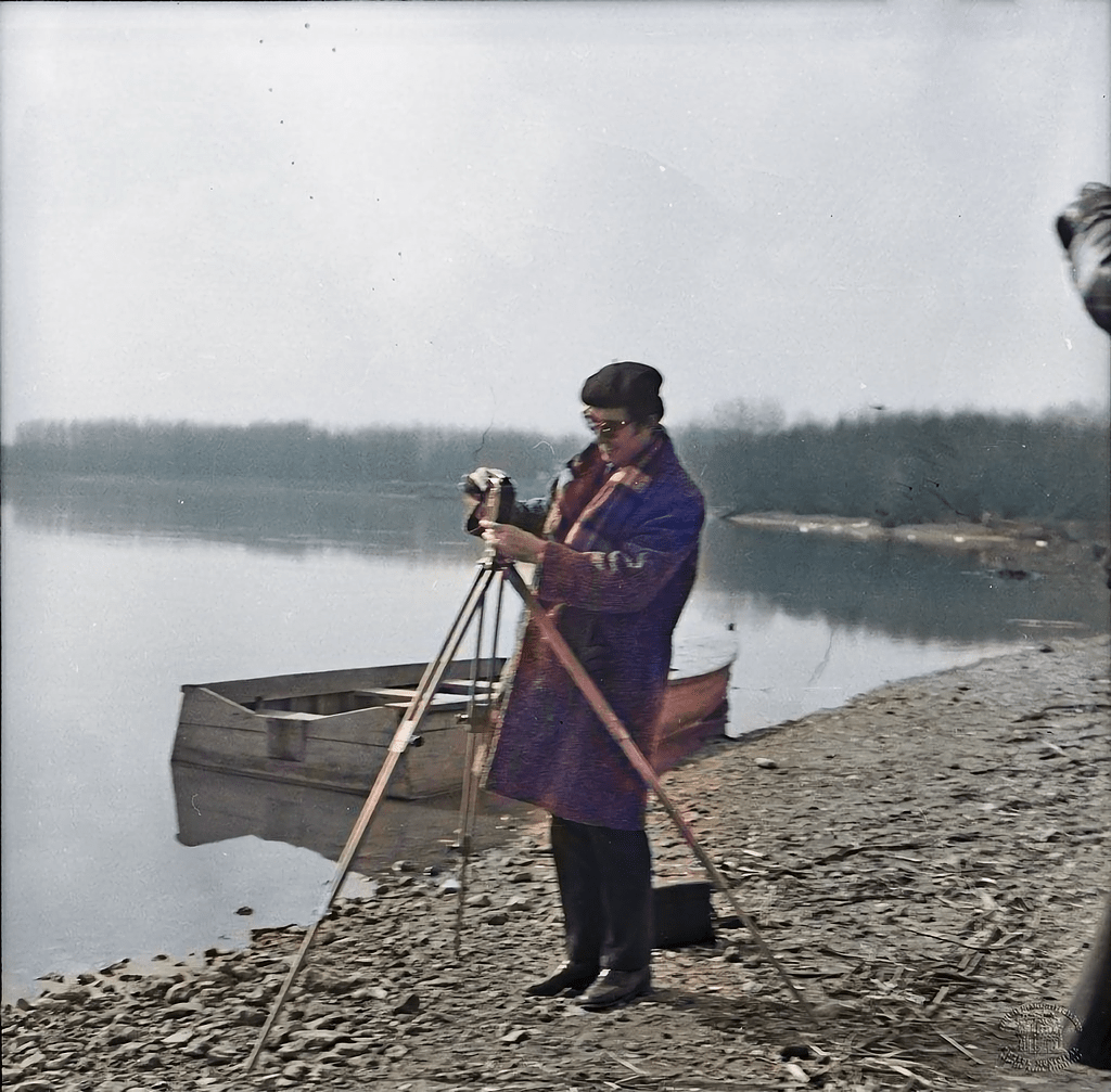 Dumitru Simionescu se pregătește de filmare pe malul Borcei(fotografie realizată de Aurel Elefterescu și colorată digital)