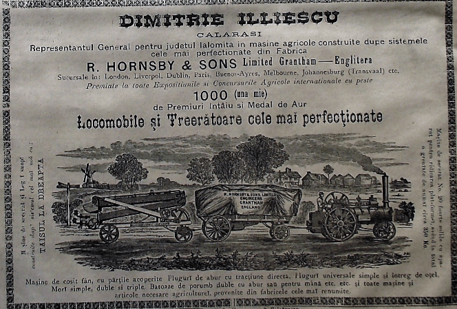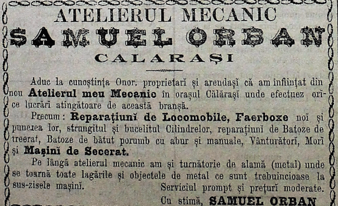 În aceste condiții, este firesc ca să apară stabilimentele comerciale și atelierele pentru întreținerea și repararea acestor utilaje mecanice folosite pe scară tot mai largă în exploatațiile agricole din Bărăgan. Orașul Călărași, capitala județului Ialomița, cel mai important județ al României din punct de vedere agricol, devine locul spre care se îndreaptă întreprinzătorii vremii, care vor înființa aici primele magazine și ateliere mecanice la sfârșitul secolului al XIX-lea. În imaginile de mai jos redăm copii după reclamele din presa vremii ale Magazinelor Dimitrie Iliescu și Atelierul mecanic Samuel Orban, ambele înființate în Călărași prin 1890.