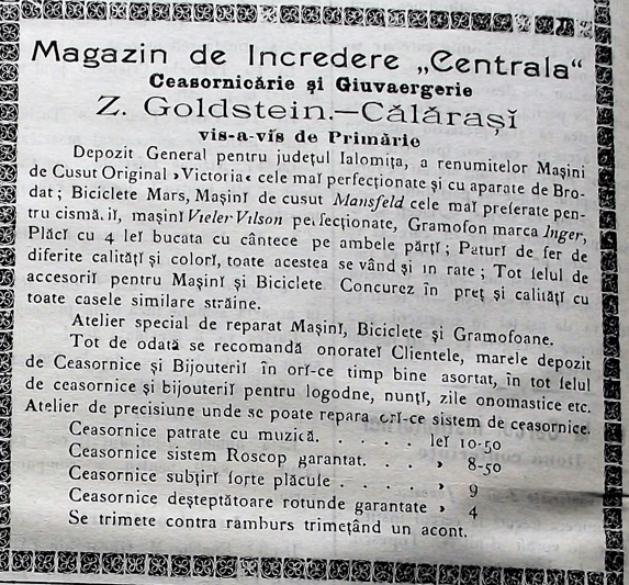 Reclamă din anul 1912 a Magazinului de ceasornicărie și giuvaergerie al lui Z. Goldstein, amplasat vis a vis de Primărie(Muzeul Municipal de azi)