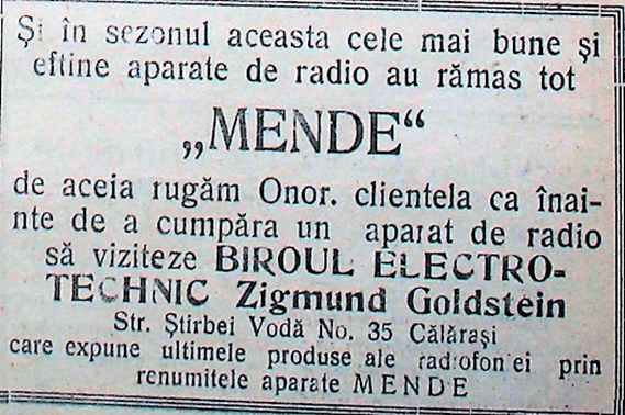 Reclamă din anul 1931 pentru aparatele de radio MENDE furnizate de Z. Goldstein prin Magazinul din str. Știrbei Vodă nr. 35